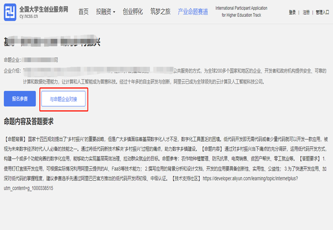 第四步:点击“与命题企业对接”,跳转至【产业命题赛道命题企业对接、企业命题申报平台】,注册登录后与命题企业对接咨询,进一步了解命题具体解答要求、获取企业支持等(详见附件3)。 注:此平台账号非大创网账号,须重新注册。
