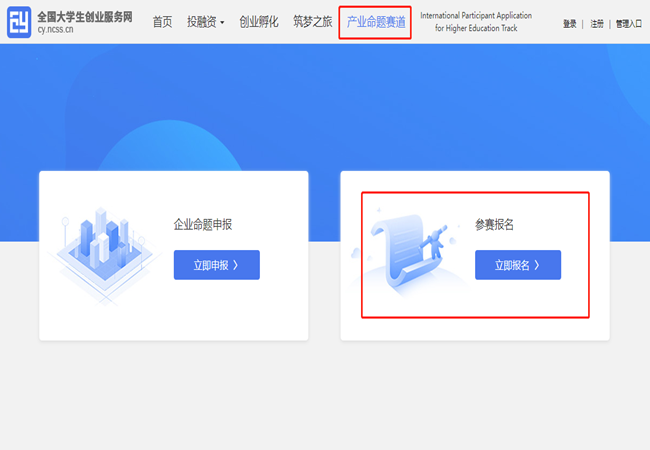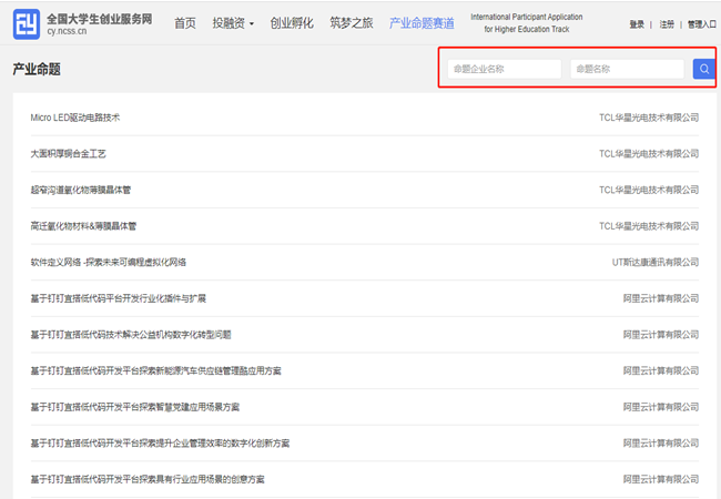 第三步:访问【全国大学生创业服务网】(网址:https://cy.ncss.cn/)—产业命题赛道—参赛报名—产业命题赛道版块,按照命题企业名称及命题名称搜索命题,浏览命题内容及答题要求。
