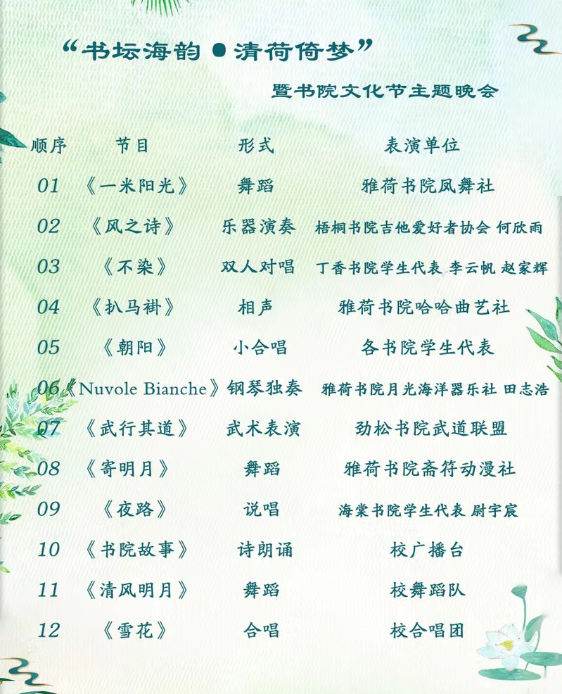金风爽,金桂香,伴随着空气中弥漫着的桂花的清香和大地上铺满着的落叶的温柔,十月倏然而至。为营造良好氛围,弘扬书院文化,加深沟通交流,展现大学生良好的精神风貌,第二届“书坛海韵·清荷倚梦”暨书院文化节主题晚会将于10月9日晚在音乐广场举行。