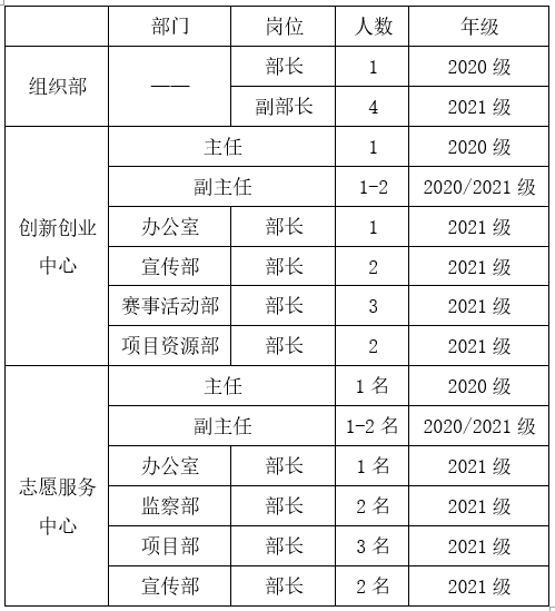 为进一步完善校区团委组织机构建设,保障校区团委工作的连续性,充实校区团委的工作力量,更好地凝聚和服务全校青年,校区团委下属直属部门组织部、创新创业中心、志愿服务中心将开始换届工作,面向校区2020级、2021级同学招募部长及中心主任。现将有关事宜通知如下: