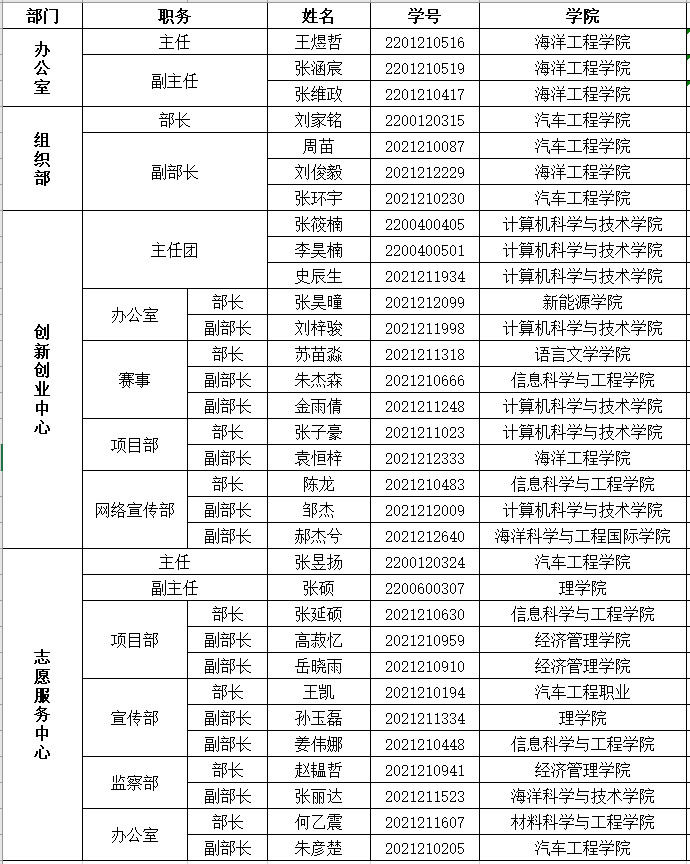 校区团委直属部门办公室、组织部、创新创业部、志愿服务部已经完成换届,现将部长及以上人员进行公示,详细名单见下表。