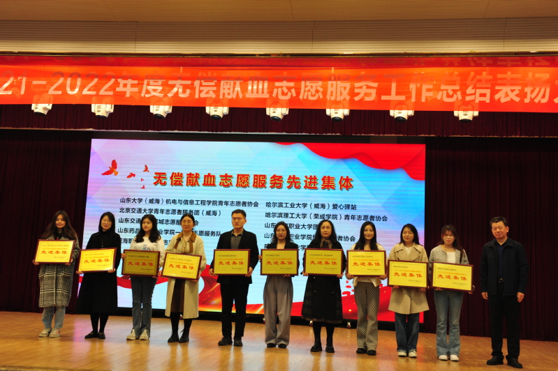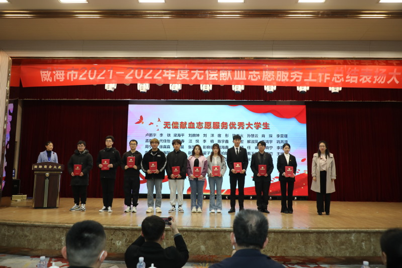 3月26日,威海市2021-2022年度无偿献血暨志愿服务总结表彰大会在威海国际商务大酒店举行,威海市文明办、团市委、市红十字会、市卫健委、市中心血站、驻威高校以及获奖集体和个人等240余人参加活动。校区爱心驿站荣获“高校无偿献血志愿服务先进集体”,刘鼎坤、刘洋、宿彤、陈石火和孙慧云5位同学荣获“无偿献血志愿服务优秀大学生”。
